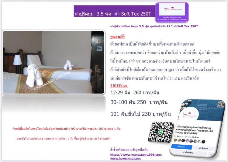 | ผ้าปูรัดมุม 3.5 ฟุต ผ้า Soft Tex 250T สีขาวเรียบ | ||||||