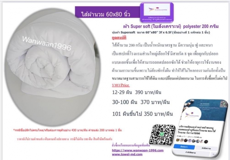 | ไส้ผ้านวม 200 กรัม เป็นน้ำหนักมาตรฐาน มีความนุ่ม ฟู และหนา | |||||||