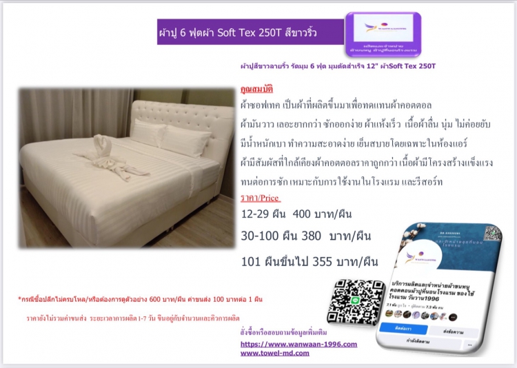 | ผ้าปูสีขาวลายริ้ว รัดมุม 6ฟุต มุมตัดสำเร็จ 12 ผ้าSoft Tex 250T | |||||||