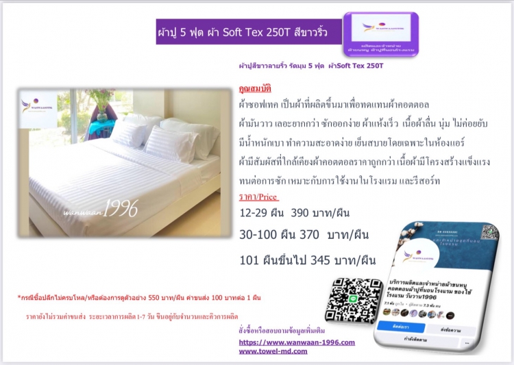 | ผ้าปูสีขาวลายริ้ว รัดมุม 5 ฟุต มุมตัดสำเร็จ 12 ผ้าSoft Tex 250T | |||||||