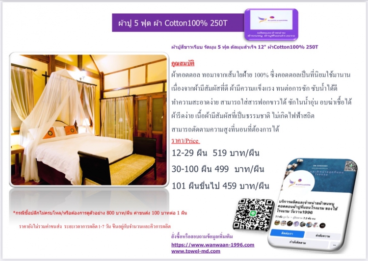 | ผ้าปูสีขาวเรียบ รัดมุม 5 ฟุต มุมตัดสำเร็จ 12 ผ้าCotton100% 250T | ||||