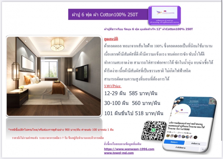 | ผ้าปูสีขาวเรียบ รัดมุม 6 ฟุต มุมตัดสำเร็จ 12 ผ้าCotton100% 250T | ||||