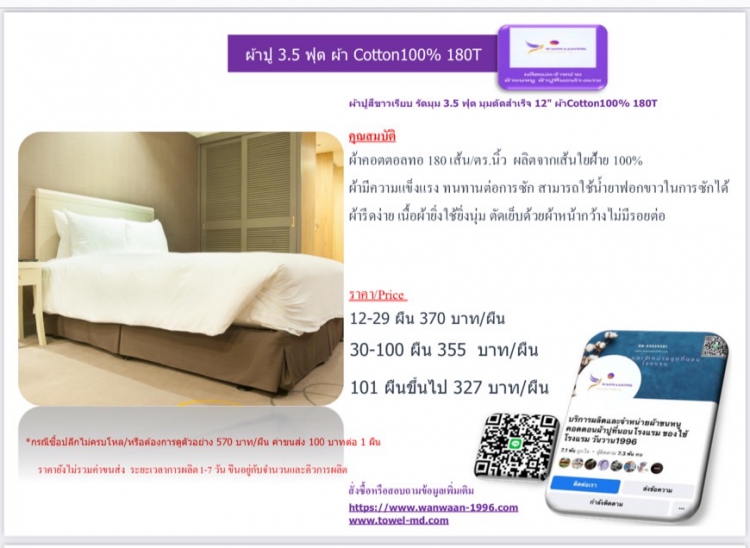 ผ้าปูสีขาวเรียบ รัดมุม 3.5 ฟุต มุมตัดสำเร็จ 12 ผ้าCotton100% 180T |