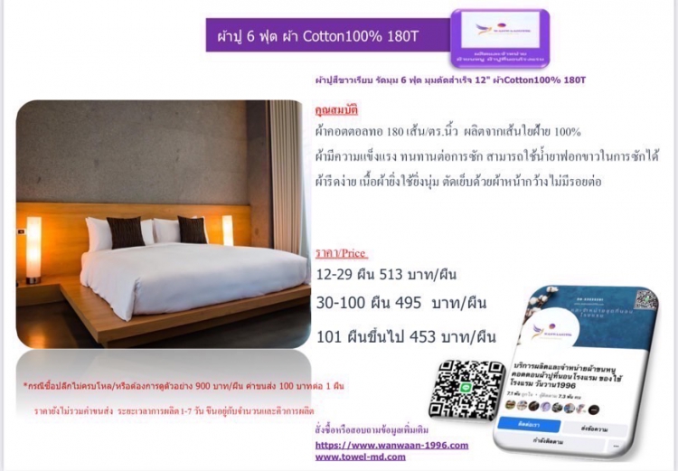 ผ้าปู 6 ฟุต ผ้า Cotton100% 180T ผ้าปูสีขาวเรียบ รัดมุม 6 ฟุต มุมตัดสำเร็จ 12 ผ้าCotton100% 180T |