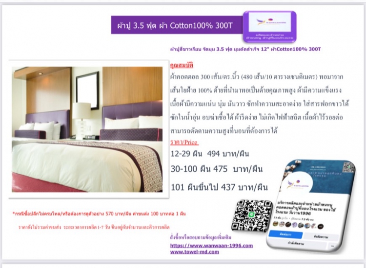 | ผ้าปูสีขาวเรียบ รัดมุม 3.5 ฟุต มุมตัดสำเร็จ 12 ผ้าCotton100% 300T | ||||