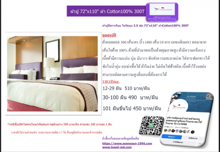 | ผ้าคอตตอล 300 เส้น/ตร.นิ้ว (480 เส้น/10 ตารางเซนติเมตร) ทอมาจาก | ||||