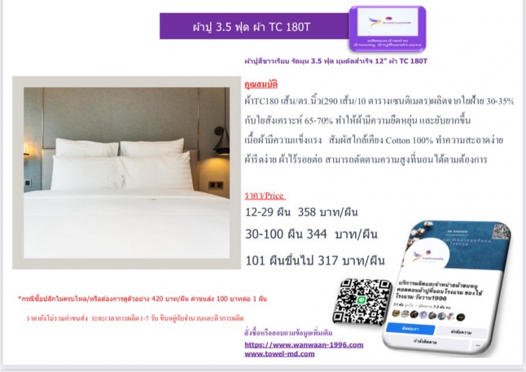 | ผ้าปูสีขาวเรียบ รัดมุม 3.5 ฟุต มุมตัดสำเร็จ 12 ผ้า TC 180T | ||||