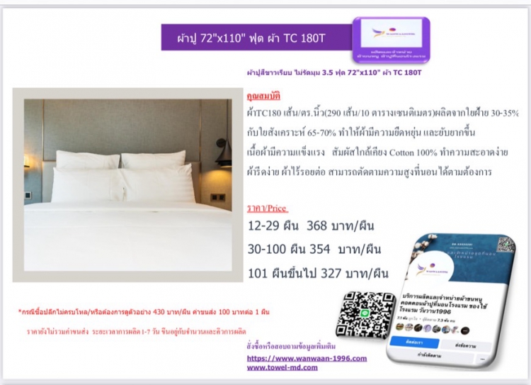 | ผ้าปูสีขาวเรียบ ไม่รัดมุม 72''x110'' 3.5 ฟุต ผ้า TC 180T | ||||