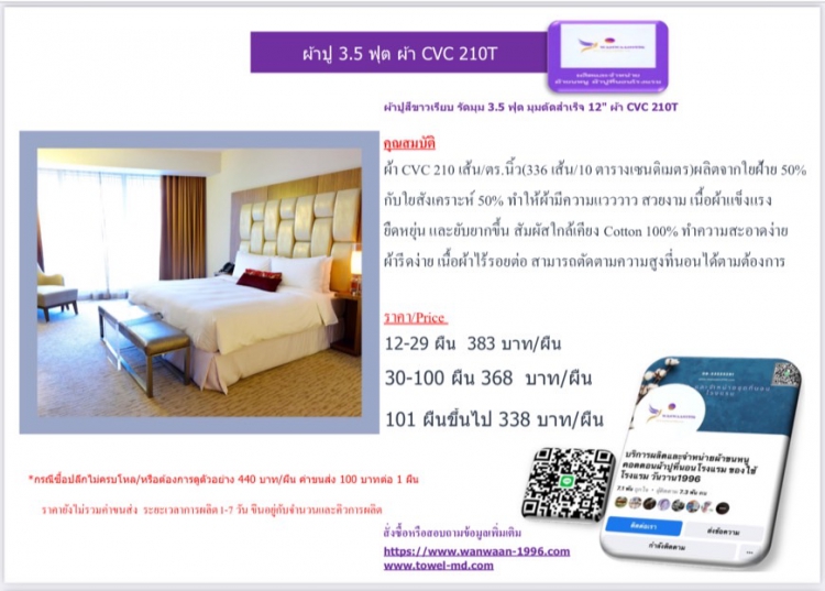 | ผ้า CVC 210 เส้น/ตร.นิ้ว(336 เส้น/10 ตารางเซนติเมตร)ผลิตจากใยฝ้าย 50% | ||||