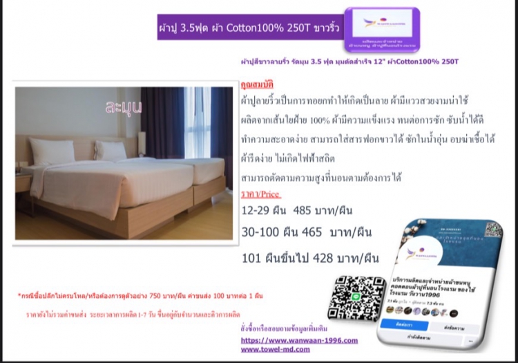 | ผ้าปูสีขาวลายริ้ว รัดมุม 3.5 ฟุต 12 นิ้ว ผ้าCotton100% 250T | ||||