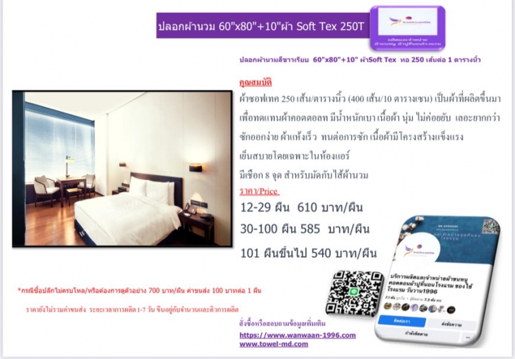 | ปลอกผ้านวมสีขาวเรียบ 60x80+10 ผ้าSoft Tex ทอ 250 เส้นต่อ 1 ตารางนิ้ว | ||||