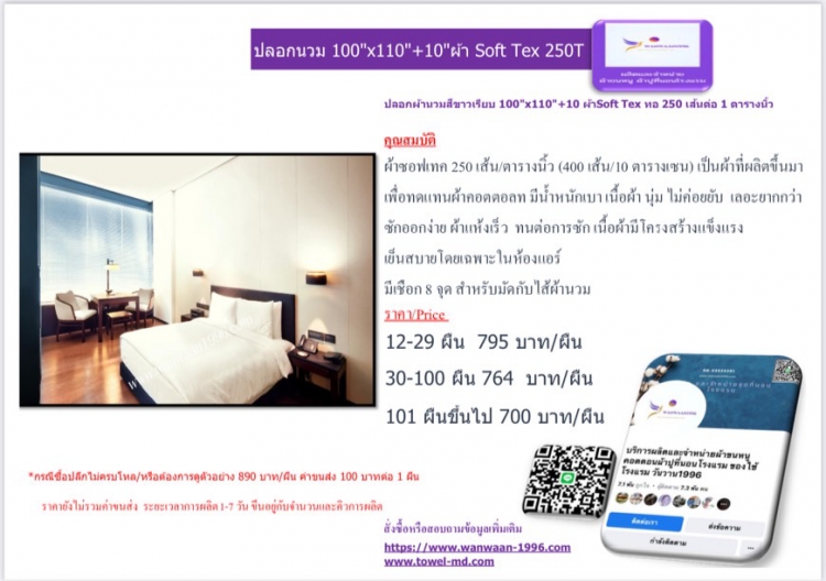 | ปลอกผ้านวมสีขาวเรียบ 100x110+10 ผ้าSoft Tex ทอ 250 เส้นต่อ 1 ตารางนิ้ว | ||||