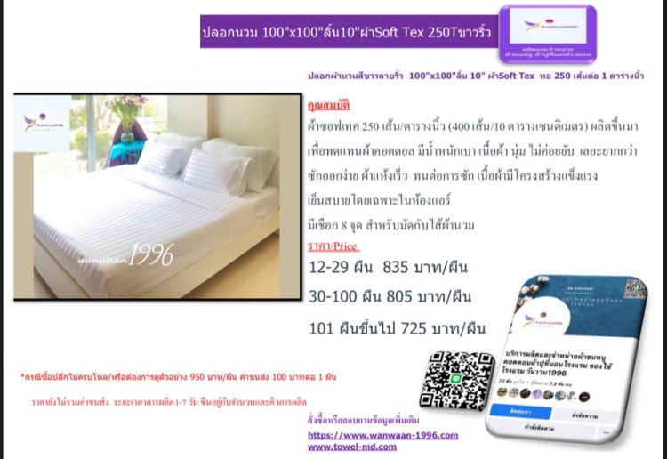 | ปลอกผ้านวมสีขาวลายริ้ว 100x100+10 ผ้า Soft Tex ทอ 250 เส้นต่อ 1 ตารางนิ้ว | ||||