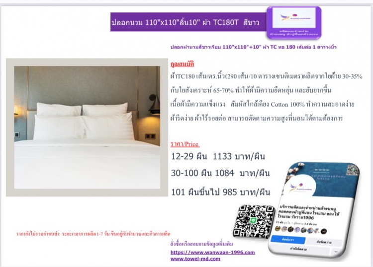| ปลอกผ้านวมสีขาวเรียบ 110x110ลิ้น 10 ผ้า TC ทอ 180 เส้นต่อ 1 ตารางนิ้ว | ||||