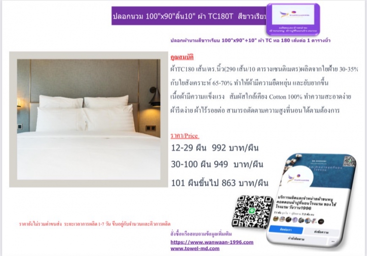 | ปลอกผ้านวมสีขาวเรียบ 100x9 0ลิ้น 10 ผ้า TC ทอ 180 เส้นต่อ 1 ตารางนิ้ว | ||||
