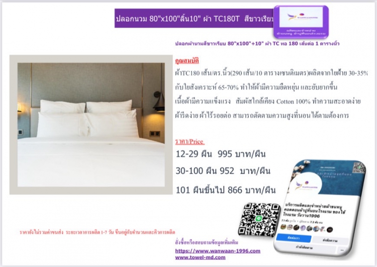 | ปลอกผ้านวมสีขาวเรียบ 80x100ลิ้น 10 ผ้า TC ทอ 180 เส้นต่อ 1 ตารางนิ้ว | ||||