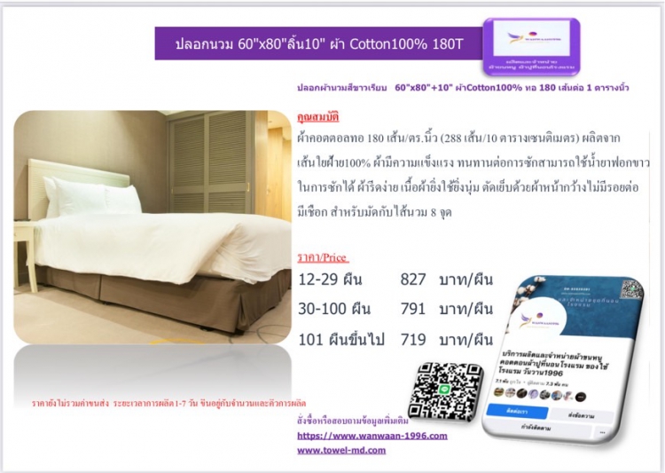 | ปลอกผ้านวมสีขาวเรียบ 60x80+10 ผ้าCotton100% ทอ 180 เส้นต่อ 1 ตารางนิ้ว | ||||