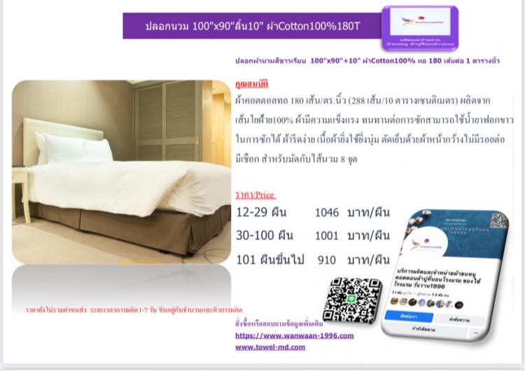| ปลอกผ้านวมสีขาวเรียบ 100x90+10 ผ้าCotton100% ทอ 180 เส้นต่อ 1 ตารางนิ้ว | ||||