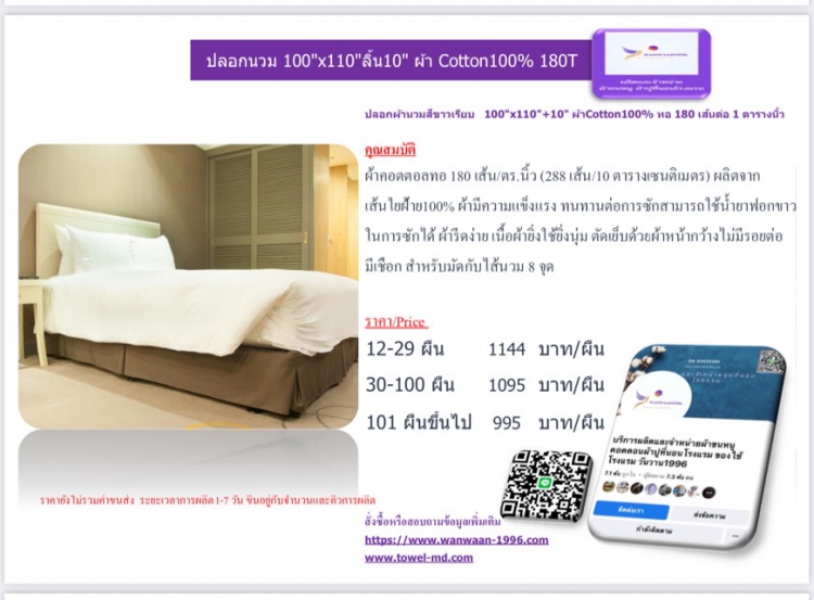 | ปลอกผ้านวมสีขาวเรียบ 100x110+10 ผ้าCotton100% ทอ 180 เส้นต่อ 1 ตารางนิ้ว | ||||