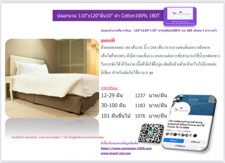 | ปลอกผ้านวมสีขาวเรียบ 110x120+10 ผ้าCotton100% ทอ 180 เส้นต่อ 1 ตารางนิ้ว | ||||
