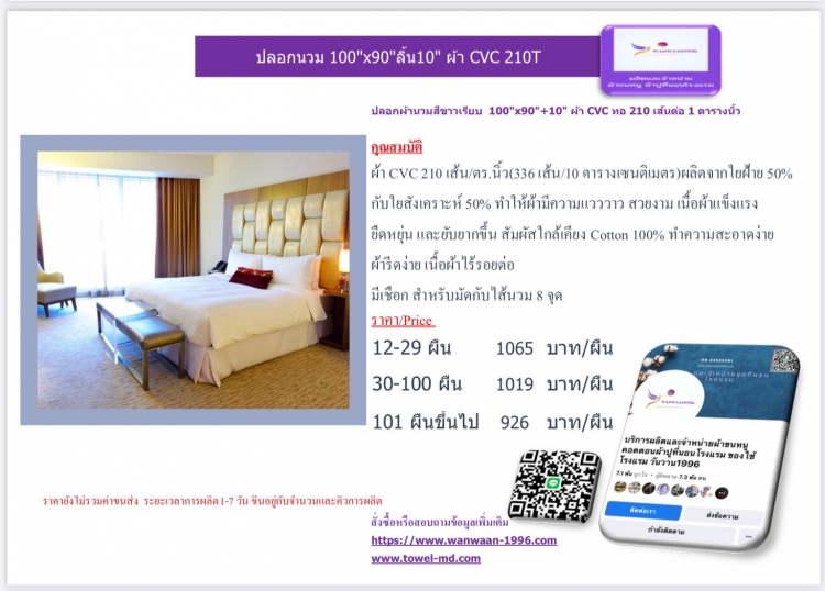 | ปลอกผ้านวมสีขาวเรียบ 100x90+10 ผ้า CVC ทอ 210 เส้นต่อ 1 ตารางนิ้ว | ||||