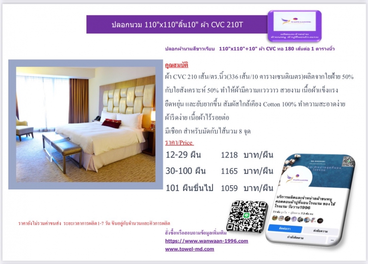 | ปลอกผ้านวมสีขาวเรียบ 110x110+10 ผ้า CVC ทอ 210 เส้นต่อ 1 ตารางนิ้ว | ||||