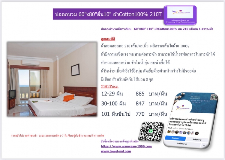 | ปลอกผ้านวมสีขาวเรียบ 60x80+10 ผ้าCotton100% ทอ 210 เส้นต่อ 1 ตารางนิ้ว | ||||