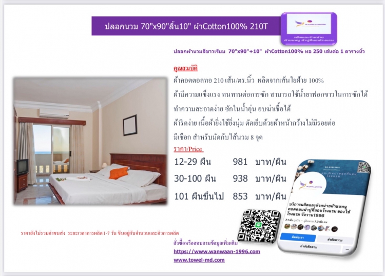 | ปลอกผ้านวมสีขาวเรียบ 70x90+10 ผ้าCotton100% ทอ 210 เส้นต่อ 1 ตารางนิ้ว | ||||