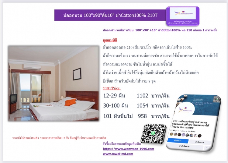 | ปลอกผ้านวมสีขาวเรียบ 100x90+10 ผ้าCotton100% ทอ 210 เส้นต่อ 1 ตารางนิ้ว | ||||