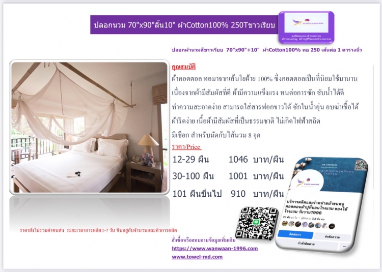 | ปลอกผ้านวมสีขาวเรียบ 70x90+10 ผ้าCotton100% ทอ 250 เส้นต่อ 1 ตารางนิ้ว | ||||
