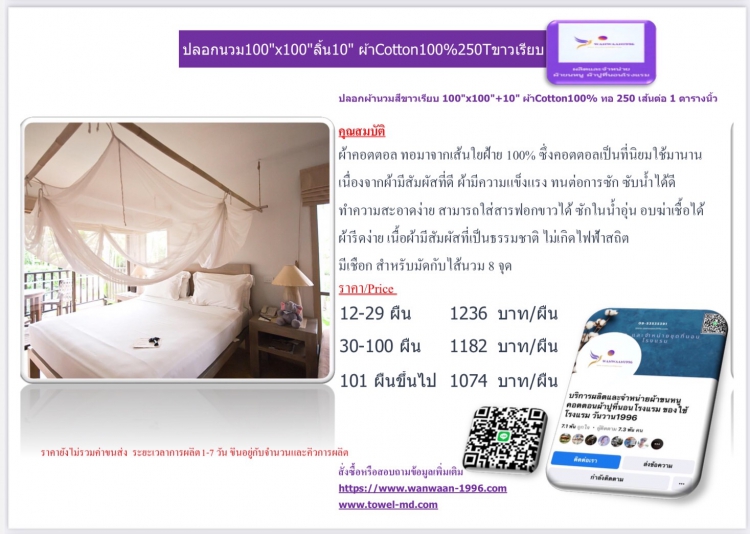 ปลอกผ้านวมสีขาวเรียบ 100"x100"+10" ผ้าCotton100% ทอ 250 เส้น