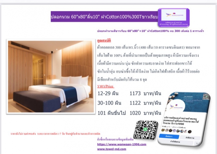 | ปลอกผ้านวมสีขาวเรียบ 60x80+10 ผ้าCotton100% ทอ 300 เส้นต่อ 1 ตารางนิ้ว | ||||