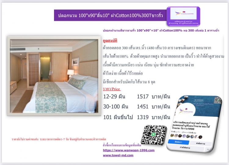 | ปลอกผ้านวมสีขาวลายริ้ว 100x90 ลิ้น10 ผ้าCotton100% ทอ 300 เส้นต่อ 1 ตารางนิ้ว | |||||
