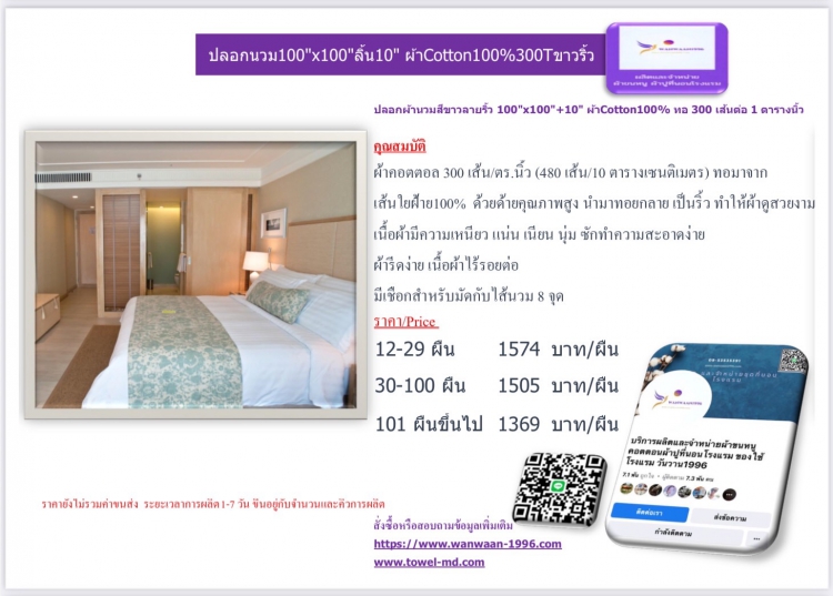| ปลอกผ้านวมสีขาวลายริ้ว 100x100 ลิ้น10 ผ้าCotton100% ทอ 300 เส้นต่อ 1 ตารางนิ้ว | |||||