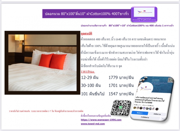 | ปลอกผ้านวมสีขาวลายริ้ว 80x100ลิ้น10 ผ้าCotton100% ทอ 400 เส้นต่อ 1 ตารางนิ้ว | ||||