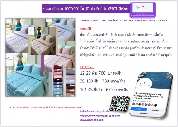 | ปลอกผ้านวมผ้าสี 100x90 ลิ้น10 ผ้า Soft tex เรียบทอ 250 เส้นต่อ 1 ตารางนิ้ว | ||||