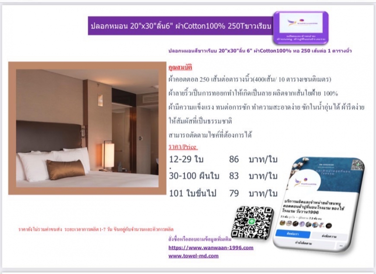 | ปลอกหมอนสีขาวเรียบ 20x30ลิ้น 6 ผ้าCotton100% ทอ 250 เส้นต่อ 1 ตารางนิ้ว | ||||