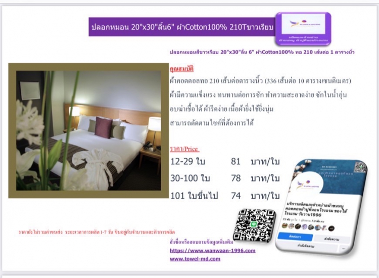 | ปลอกหมอนสีขาวเรียบ 20x30ลิ้น 6 ผ้าCotton100% ทอ 210 เส้นต่อ 1 ตารางนิ้ว | ||||