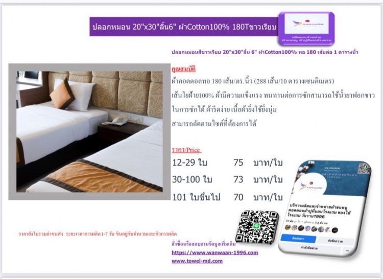 | ปลอกหมอนสีขาวเรียบ 20x30ลิ้น 6 ผ้าCotton100% ทอ 180 เส้นต่อ 1 ตารางนิ้ว | |||||