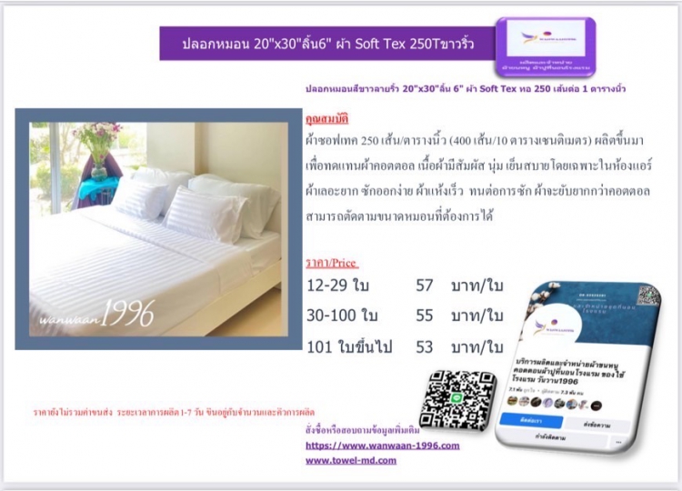 | ปลอกหมอนสีขาวลายริ้ว 20x30ลิ้น 6 ผ้า Soft Tex ทอ 250 เส้นต่อ 1 ตารางนิ้ว | ||||