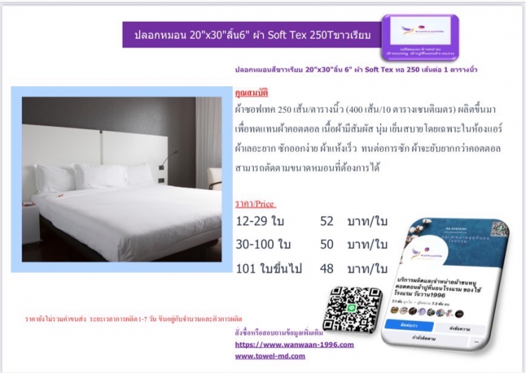 | ปลอกหมอนสีขาวเรียบ 20x30ลิ้น 6 ผ้า Soft Tex ทอ 250 เส้นต่อ 1 ตารางนิ้ว | ||||