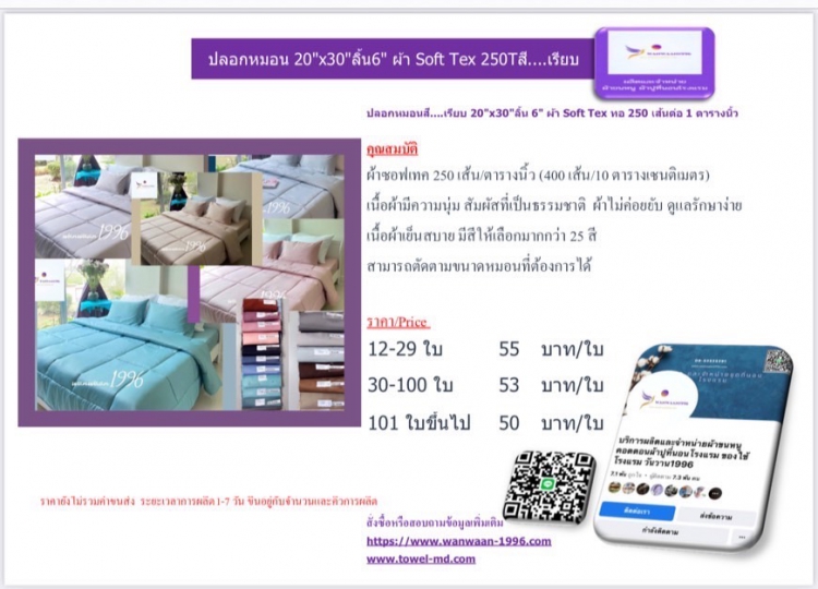 | ปลอกหมอนสี....เรียบ 20x30ลิ้น 6 ผ้า Soft Tex ทอ 250 เส้นต่อ 1 ตารางนิ้ว | ||||