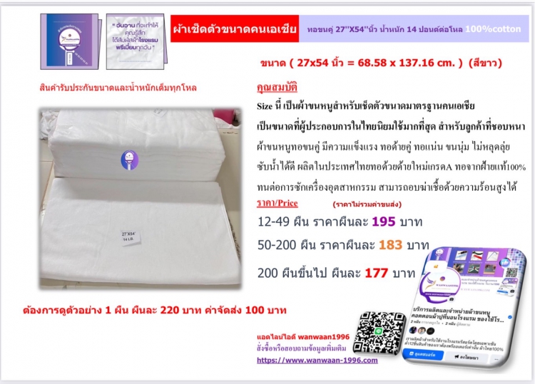 ขนาด ( 27x54 นิ้ว = 68.58 x 137.16 cm. ) 14 ปอนด์/ต่อโหล (สีขาว) ทอขนคู่ 100% cotton