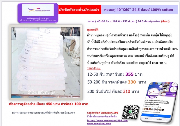 ขนาด ( 40x60 นิ้ว = 101.6 x 152.4 cm. ) 24.5 ปอนด์/ต่อโหล (สีขาว) ทอขนคู่ 100% cotton