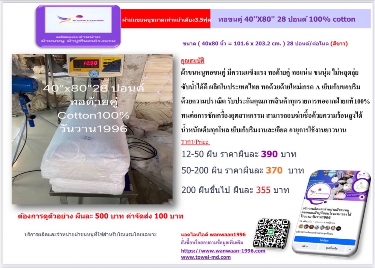 ขนาด ( 40x80 นิ้ว = 101.6 x 203.2 cm. ) 28 ปอนด์/ต่อโหล (สีขาว) ทอขนคู่ 100% cotton