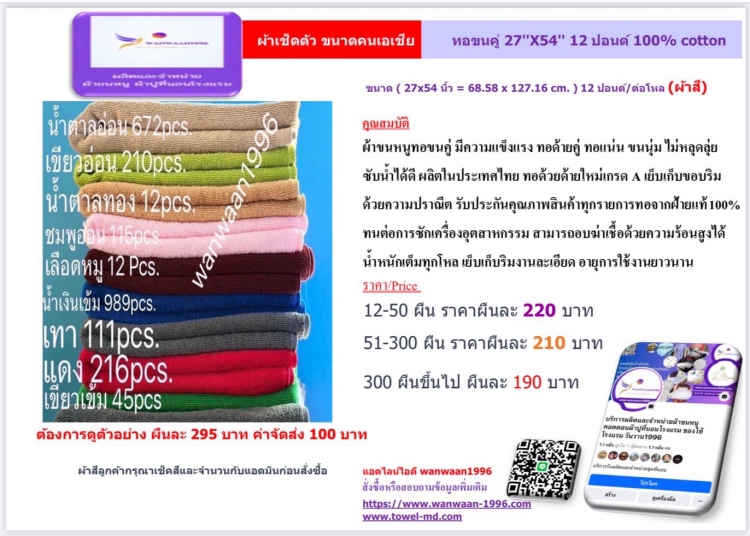 ขนาด ( 27x54 นิ้ว = 68.58 x 127.16 cm. ) 12 ปอนด์/ต่อโหล (ผ้าสี) ทอขนคู่ 100% cotton