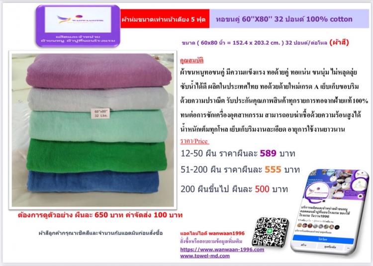 ขนาด ( 60x80 นิ้ว = 152.4 x 203.2 cm. ) 32 ปอนด์/ต่อโหล (ผ้าสี) ทอขนคู่ 100% cotton