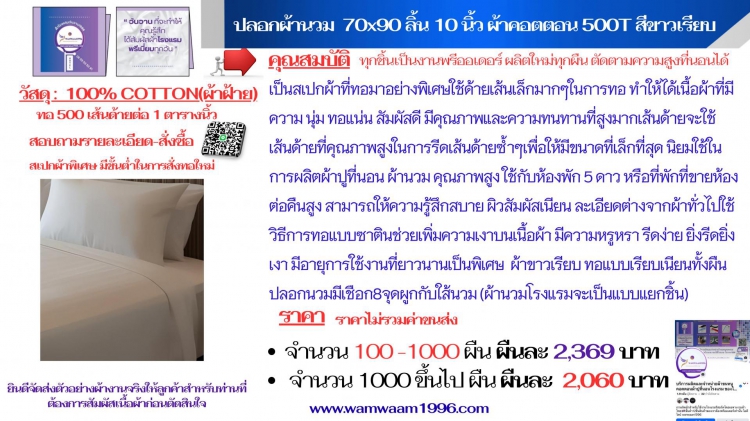 ปลอกผ้านวม 70 x 90 ลิ้น 10 นิ้ว ผ้า cotton100% 500T สีขาวเรียบ