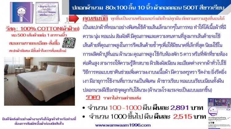 เป็นสเปกผ้าที่ทอมาอย่างพิเศษใช้ด้ายเส้นเล็กมากๆในการทอ ทำให้ได้เนื้อผ้าที่มีความ นุ่ม ทอแน่น สัมผัสดี มีคุณภาพและความทนทานที่สูงมากเส้นด้ายจะใช้เส้นด้ายที่คุณภาพสูงในการรีดเส้นด้ายซ้ำๆเพื่อให้มีขนาดที่เล็กที่สุด นิยมใช้ในการผลิตผ้าปูที่นอน ผ้านวม คุณภาพสูง ใช้กับห้องพัก 5 ดาว หรือที่พักที่ขายห้องต่อคืนสูง สามารถให้ความรู้สึกสบาย ผิวสัมผัสเนียน ละเอียดต่างจากผ้าทั่วไปใช้วิธีการทอแบบซาตินช่วยเพิ่มความเงาบนเนื้อผ้า มีความหรูหรา รีดง่าย ยิ่งรีดยิ่งเงา มีอายุการใช้งานที่ยาวนานเป็นพิเศษ ผ้าขาวเรียบ ทอแบบเรียบเนียนทั้งผืน ปลอกผ้านวมจะมีเชือก 8 จุด สำหรับมัดเข้ากับใส้นวมเมื่อใช้งาน ช่วยให้ใส้ไม่กอง หรือเลื่อนหลุดเมื่อลูกค้าใช้งาน (ผ้านวมโรงแรมจะเป็นแบบแยกชิ้น) เพื่อให้ง่ายต่อการรักษา และการซัก ข้อดีของปลอกผ้านวมแบบแยกชิ้น ซักง่าย ถอดซักได้เหมือนปลอกหมอน แห้งเร็ว รักษาสัมผัสของผ้าให้ดีอยู่เสมอ อายุการใช้งานจะยาวนานกว่าผ้านวมแบบเย็บติด