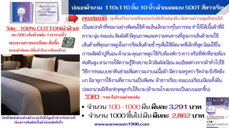 เป็นสเปกผ้าที่ทอมาอย่างพิเศษใช้ด้ายเส้นเล็กมากๆในการทอ ทำให้ได้เนื้อผ้าที่มีความ นุ่ม ทอแน่น สัมผัสดี มีคุณภาพและความทนทานที่สูงมากเส้นด้ายจะใช้เส้นด้ายที่คุณภาพสูงในการรีดเส้นด้ายซ้ำๆเพื่อให้มีขนาดที่เล็กที่สุด นิยมใช้ในการผลิตผ้าปูที่นอน ผ้านวม คุณภาพสูง ใช้กับห้องพัก 5 ดาว หรือที่พักที่ขายห้องต่อคืนสูง สามารถให้ความรู้สึกสบาย ผิวสัมผัสเนียน ละเอียดต่างจากผ้าทั่วไปใช้วิธีการทอแบบซาตินช่วยเพิ่มความเงาบนเนื้อผ้า มีความหรูหรา รีดง่าย ยิ่งรีดยิ่งเงา มีอายุการใช้งานที่ยาวนานเป็นพิเศษ ผ้าขาวเรียบ ทอแบบเรียบเนียนทั้งผืน ปลอกผ้านวมจะมีเชือก 8 จุด สำหรับมัดเข้ากับใส้นวมเมื่อใช้งาน ช่วยให้ใส้ไม่กอง หรือเลื่อนหลุดเมื่อลูกค้าใช้งาน (ผ้านวมโรงแรมจะเป็นแบบแยกชิ้น) เพื่อให้ง่ายต่อการรักษา และการซัก ข้อดีของปลอกผ้านวมแบบแยกชิ้น ซักง่าย ถอดซักได้เหมือนปลอกหมอน แห้งเร็ว รักษาสัมผัสของผ้าให้ดีอยู่เสมอ อายุการใช้งานจะยาวนานกว่าผ้านวมแบบเย็บติด
